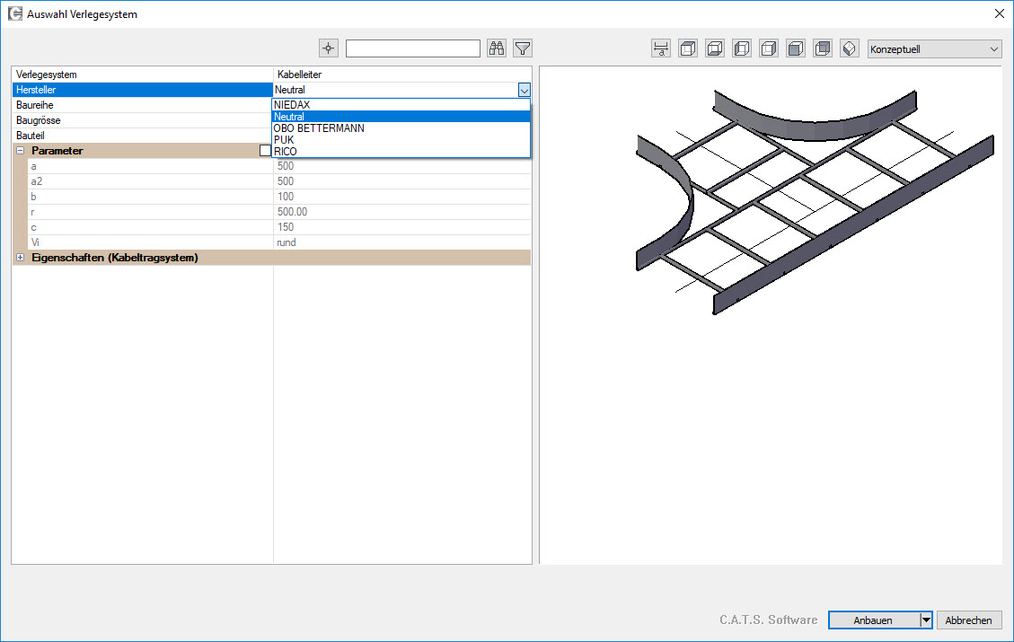 Für Kabeltragsysteme stehen Bauteile der Hersteller NIEDAX, OBO Bettermann, PUK, RICO sowie ein herstellerneutralen Katalog mit insgesamt mehr als 8000 Teilen zur Verfügung. Darüber hinaus können die Abmessungen sämtlicher Teile auch abgeändert und somit benutzerspezifisch verwendet werden.