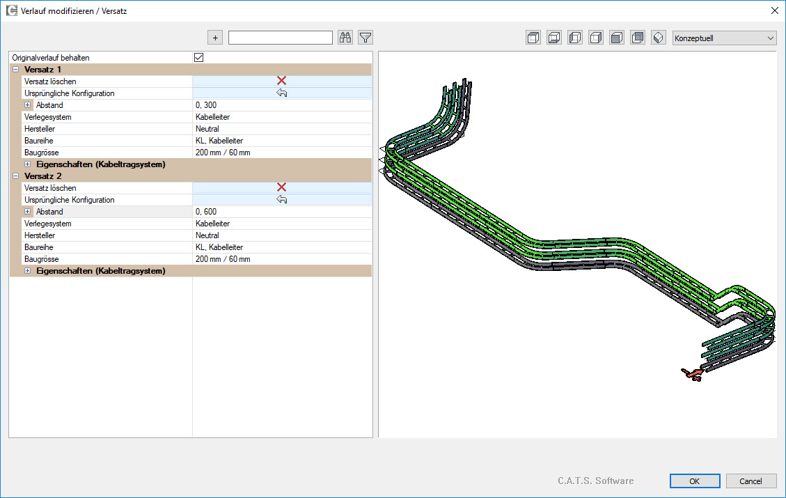 Dynamische 3D Voransichten der Bauteile unterstützen bei Auswahl und Anpassung; sämtliche Bauteile besitzen Anschlussintelligenzen und können exakt positioniert werden. Komplette zusammenhängende Trassenverläufe können einfach versetzt, mehrfach dupliziert oder in Art und Dimension verändert werden.
