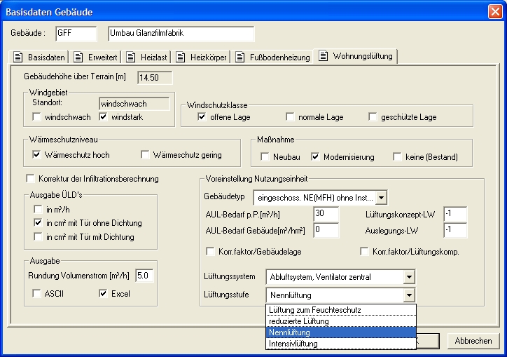 - Freie Wahl der Lüftungsstufen. Mit dieser Option kann man von den Vorgaben der DIN 1946-6 abweichen. Eigentlich dürfte die DIN nur die Lüftung zum Feuchteschutz (Lüftungsstufe FL) vorschreiben. Eine darüber hinausgehende Lüftungsstufe müsste mit dem Auftraggeber vereinbart werden. Diese Vorgehensweise wird auch in der DIN EN 12831 praktiziert.